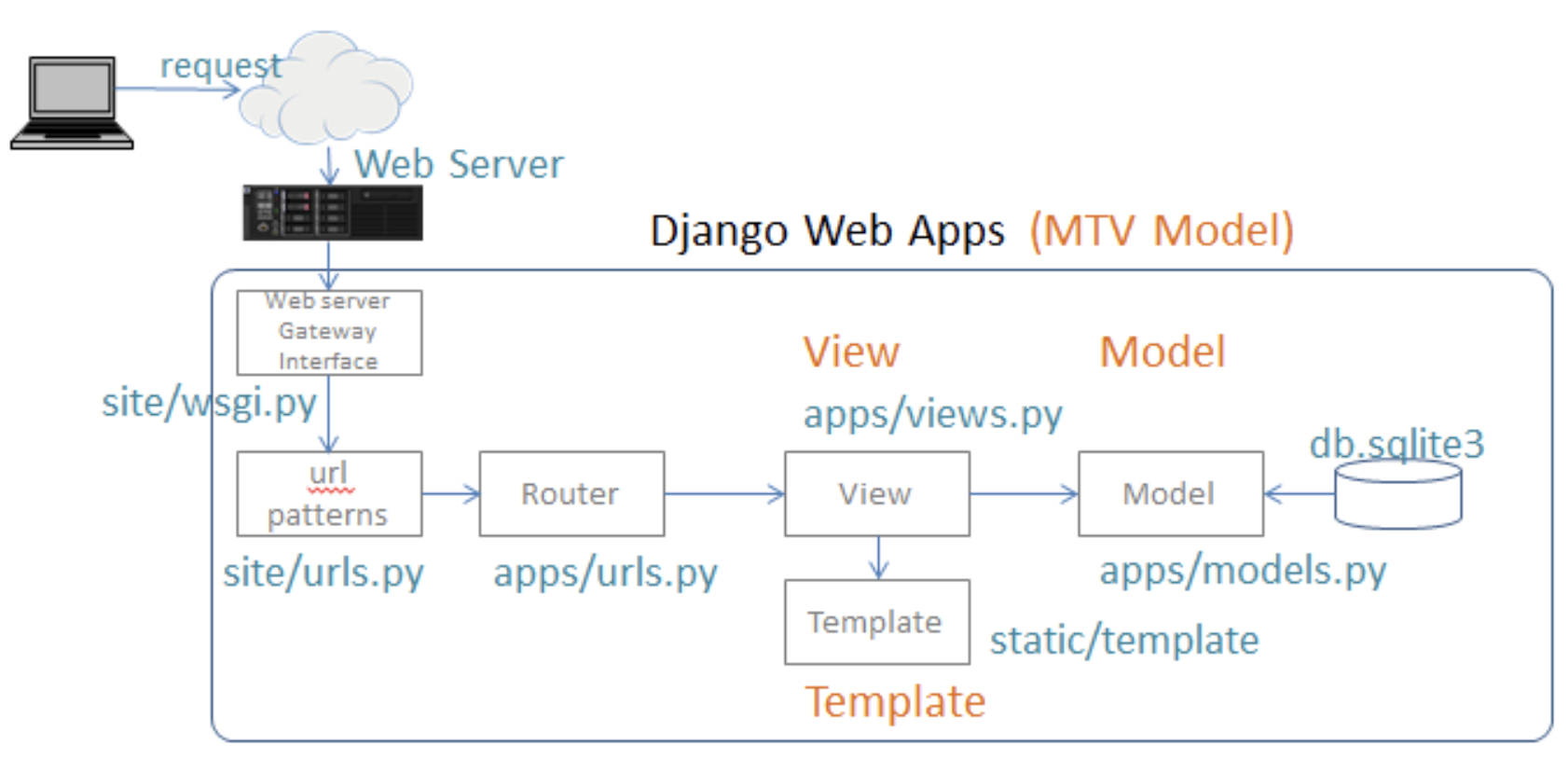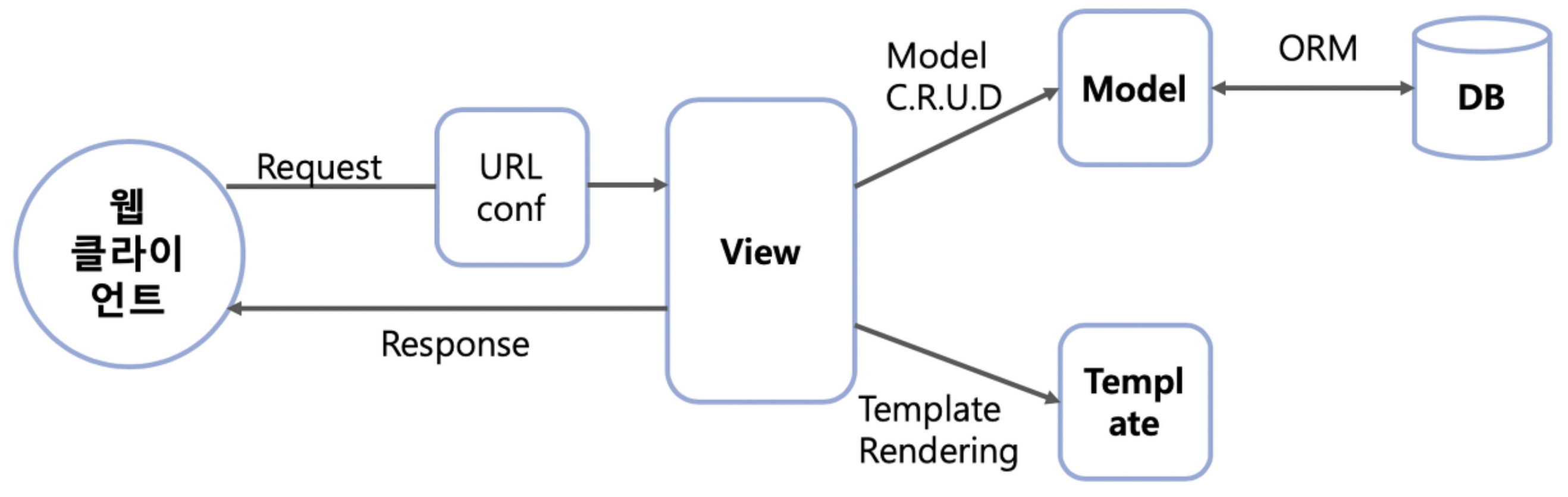 - 전통적인 MVC 디자인 패턴에서 이야기하는 컨트롤러의 기능을 프레임워크를 자체에서 하기 때문에 모델(Model), 템플릿(Template), 뷰(View)로 분류해 MTV 프레임워크라고 보기도 한다.